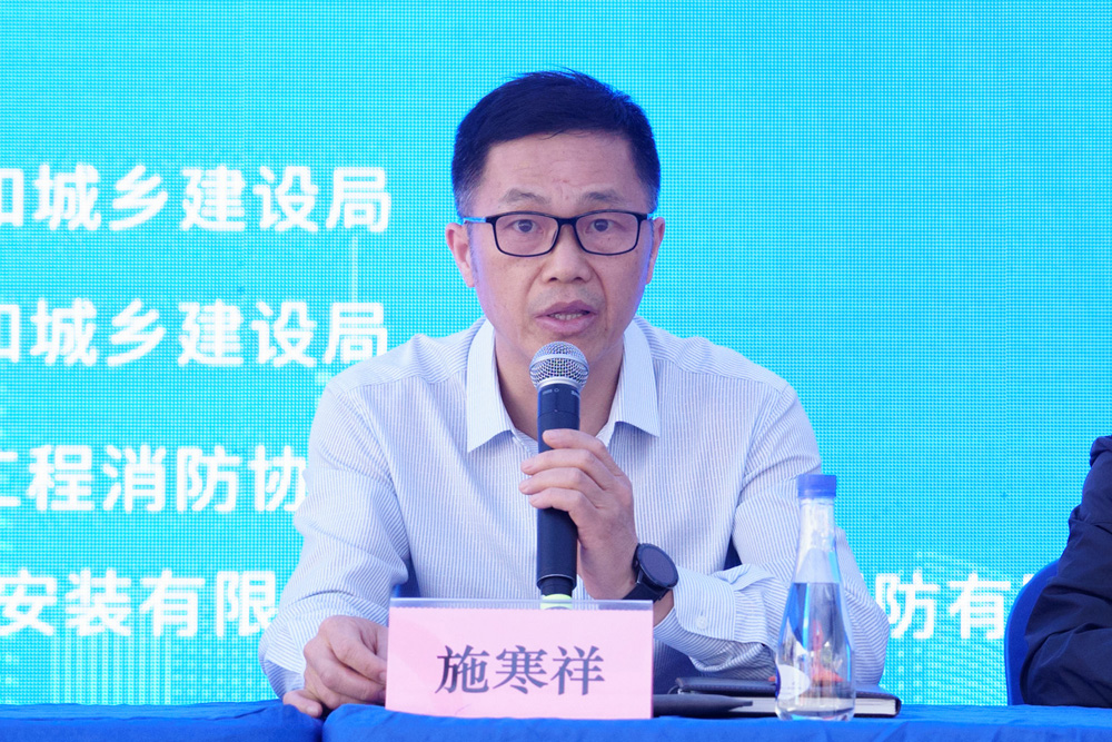 会议现场,嘉兴市南湖区住房和城乡建设局局长施寒祥、嘉兴市建设工程消防协会会长邓红、嘉兴市住房和城乡建设局党委委员、副局长朱斌为本次会议致辞发言。
