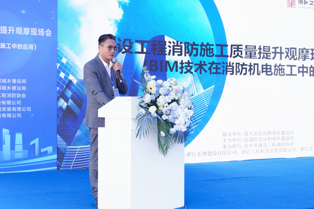2025年5月9日,南湖之畔波光粼粼,“建设工程消防施工质量提升观摩现场会(BIM 技术在消防机电施工中的应用)”在嘉兴湖畔酒店项目现场成功举办,近200位来自全市建筑施工、机电安装领域的行业精英齐聚一堂,共同见证BIM技术与消防机电施工碰撞出的创新火花。嘉兴市住房和城乡建设局党委委员、副局长朱斌、嘉兴市南湖区住房和城乡建设局局长施寒祥、嘉兴市建设工程消防协会会长邓红、嘉兴市经济建设投资有限公司副总经理王一超、浙江东博建设有限公司董事长单惠东以及嘉兴市住房和城乡建设局建筑业管理服务中心、南湖区住房和城乡建设局、南湖区建设工程质量安全管理服务中心、各区县住房和城乡建设局建筑业主管部门、浙江明康工程咨询有限公司、协会相关领导出席本次会议。